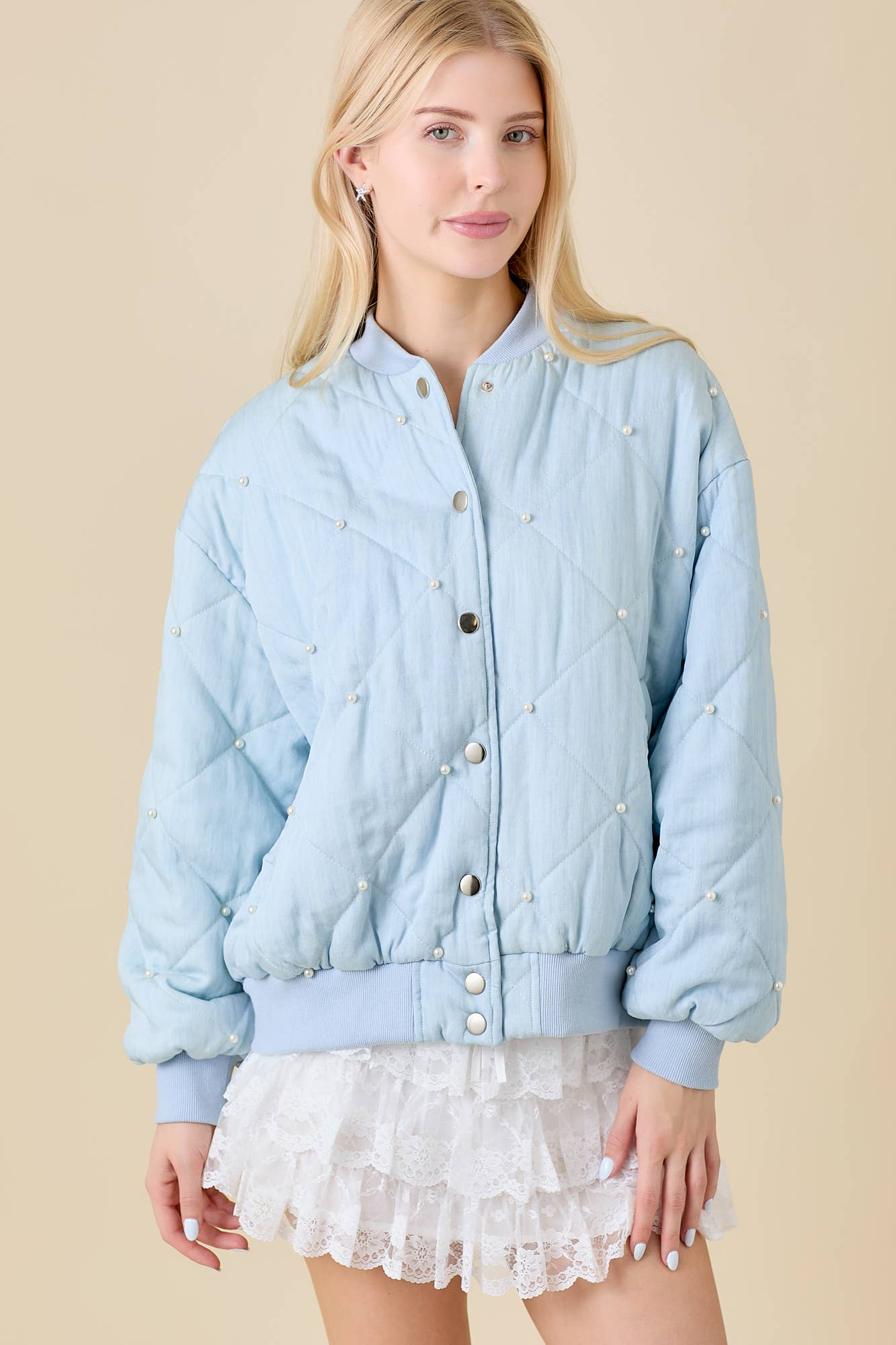 Elevate your winter look with this pearl-detailed quilted bomber jacket. The soft pastel hue and subtle pearl accents create a feminine, elegant vibe while keeping you warm and cozy. Perfect for layering over knits or dresses for a chic cold-weather outfit.